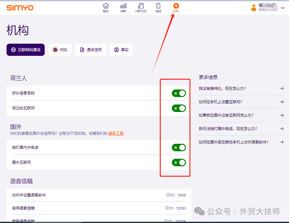 这里,大技师刚开始没明白荷兰手机号的组成,我备注时加了荷兰的区号+31,后面加上了邮件发给我以06开头的全部号码。下载写入后,大技师等了一段时间没接到任何消息,后来查询得知还有几个设置才能激活。于是我打开simyo官网:www.simyo.nl ,用邮件发给我的号码和密码登录。点击右上角齿轮图标的位置,将下图4个位置点绿。