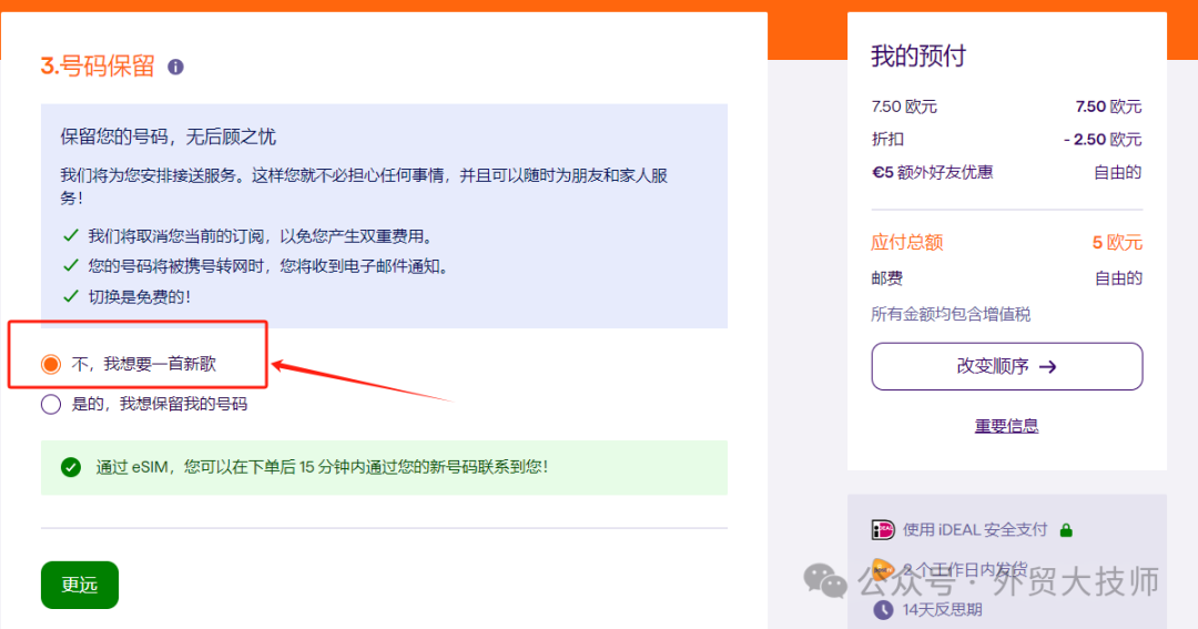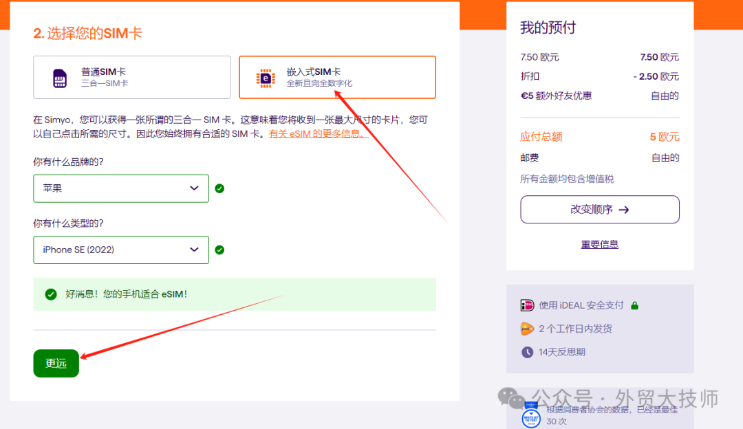 接下来一定要选择第二个“嵌入式sim卡”,有的翻译界面是“eSIM卡”。如果选错选到第一个,就会要从荷兰跨国邮寄实体卡给你了,这种实体卡就不一定能收到了。另外手机型号大家都可以按大技师图示的去选择,不会有影响。选好后点击绿色按钮继续下一步。