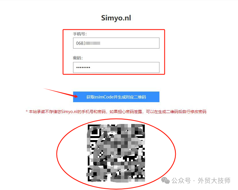 进去后还是输入上面邮件发给你的号码和密码,点击蓝色“获取eSIMcode并生成对应二维码”: