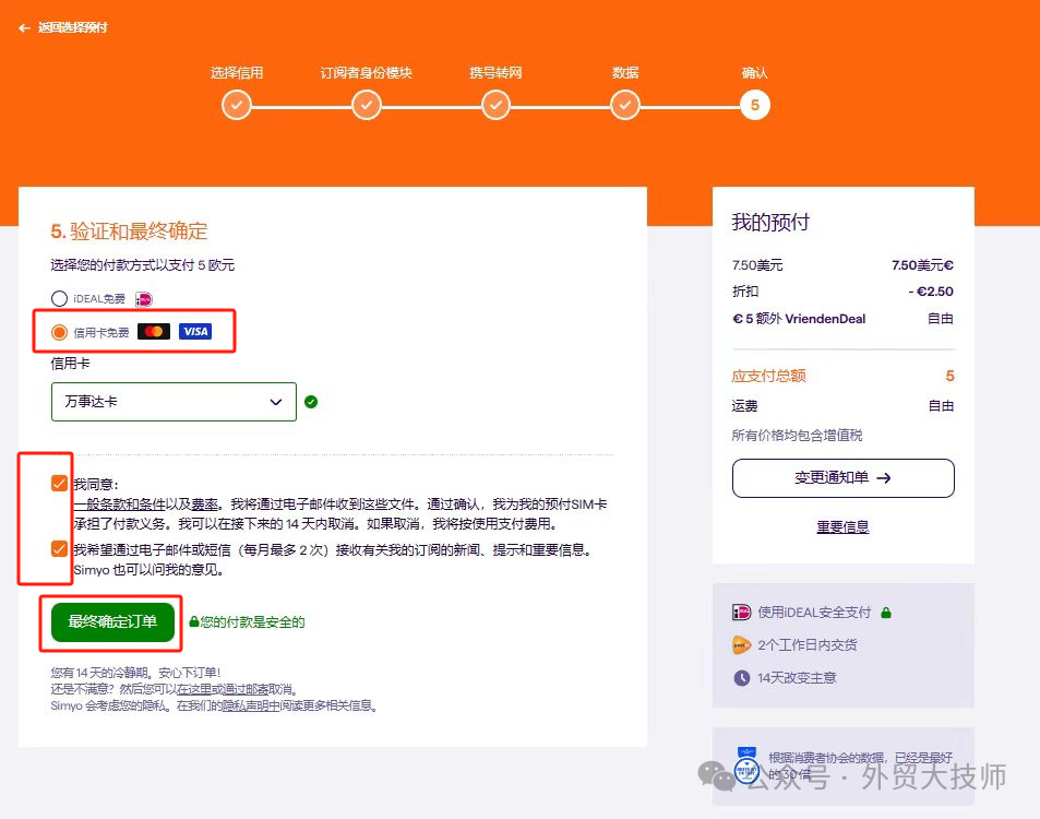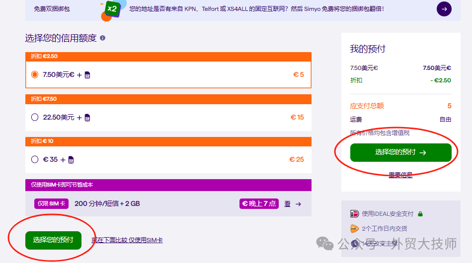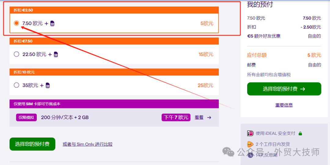 进入选套餐界面:选第一个7.5欧元含2.5欧折扣的那个套餐。