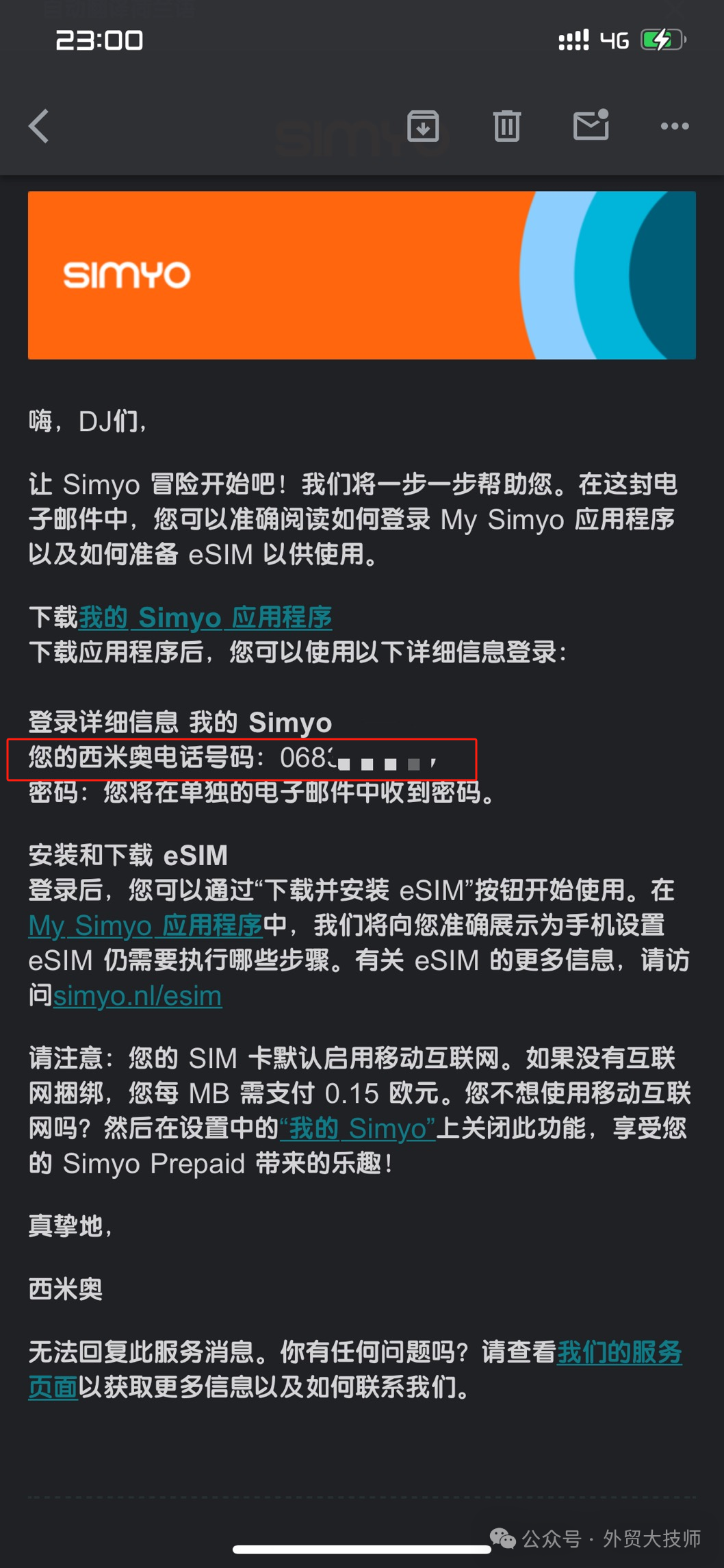 到这步,我们的号码就购买成功了。如果你拥有支持eSIM卡的手机,就可以下载simyo的APP,用上面邮件收到的号码和密码登录,激活一下eSIM写入手机里就可以使用了。可以接收到simyo发来的短信。这个短信有朋友反映可能因为信号的问题会有延迟。
