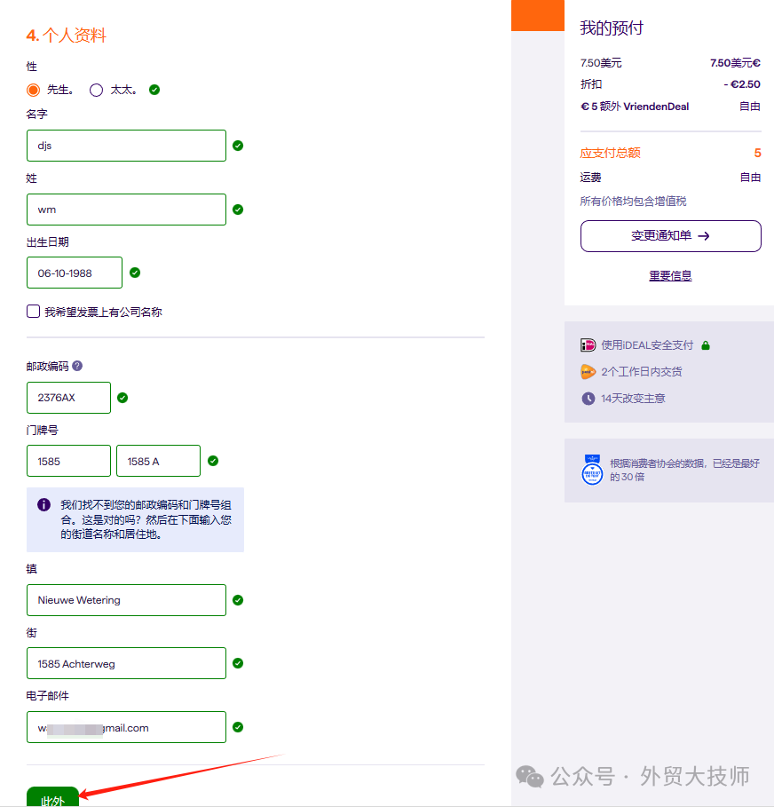 接下来个人信息这步,姓名随意填,但所填信息尽量截图保存一下,以防不时之需(后面大技师换设备时需要找客服协助,客服就让我提供了这些信息,不过在App个人资料里也能查到)。生日尽量选大于18岁的年份。然后地址就要选择荷兰的地址了。大技师复制了一个荷兰地址生成器的网站,大家可以仿照填写就可以了:https://www.addressgenerator.net/zh-cn/nl