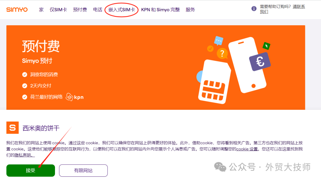 网址是荷兰语,大技师翻译了一下,大家自己对照一下。点接受,然后点击上面的“嵌入式sim卡”,也就是eSIM。